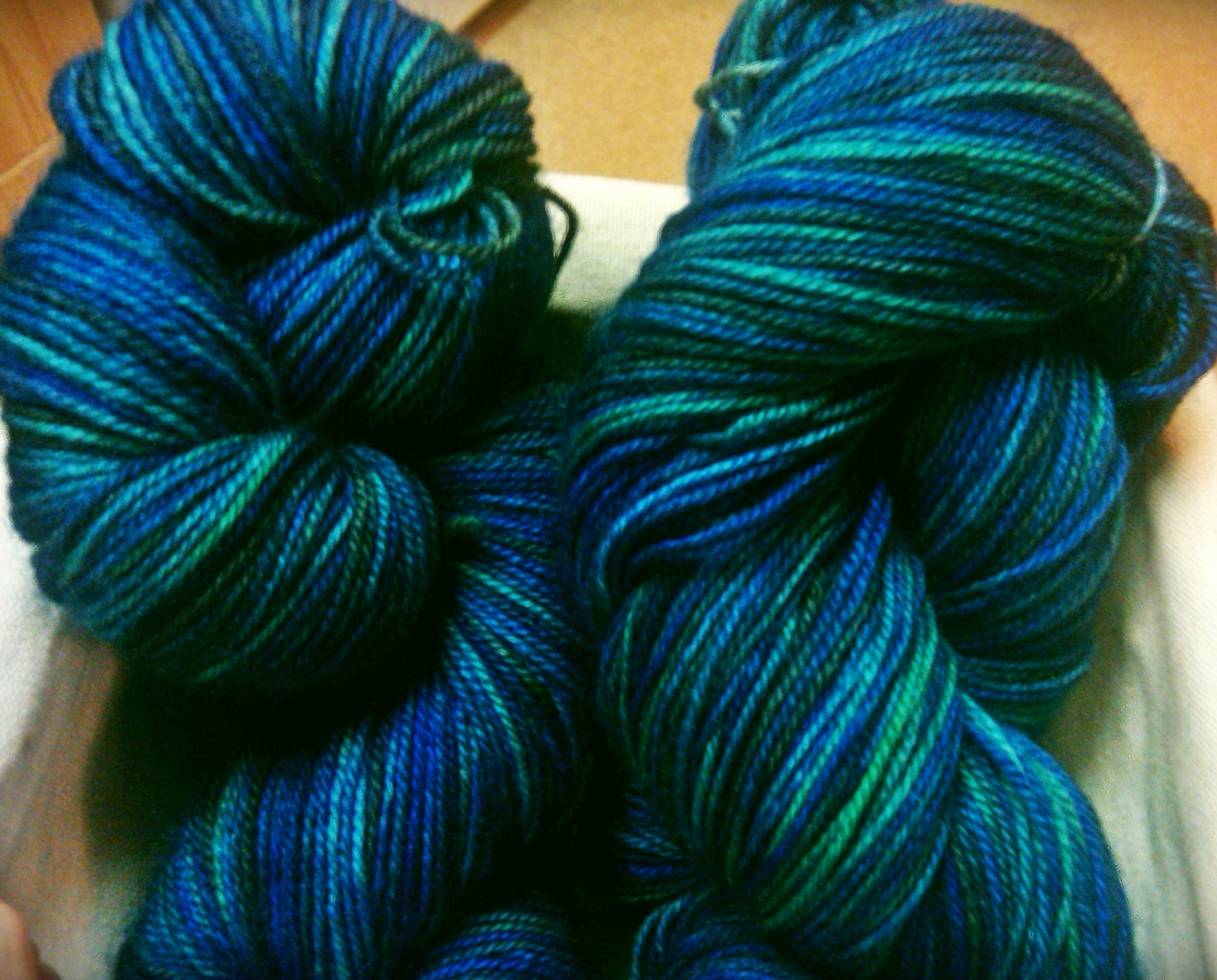 Beautiful, luxurious colors of deep blues, paler blues, sea greens, emerald and browns play onto the sparkling blue faced leiscester yarn base. It has a high aqua cast in natural and bright lights, and outside of that you can see the deeper blues that play into it. This effect is achieved from the over-dyeing and gives it unique color.